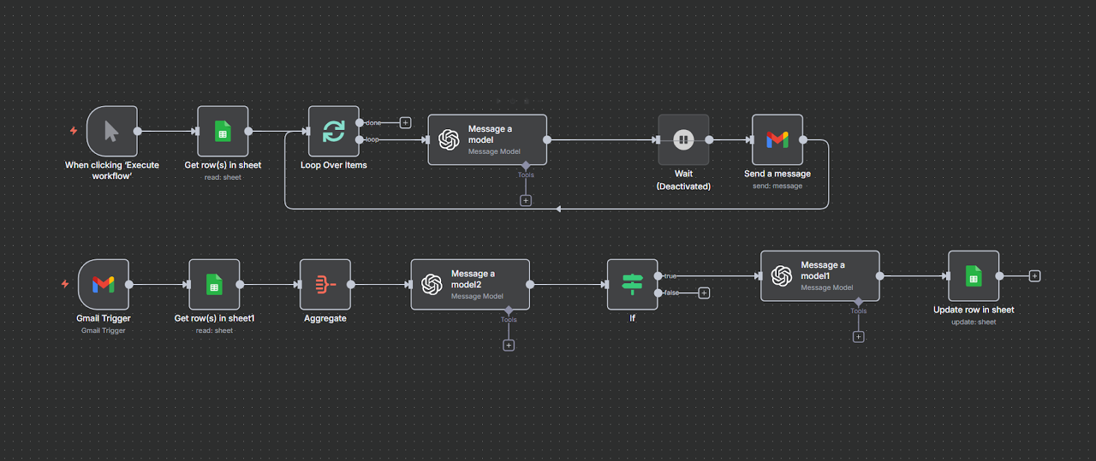 Данная автоматизация представляет собой комплексную систему для проведения персонализированных email-кампаний с использованием искусственного интеллекта. Система состоит из двух взаимосвязанных workflow: первый автоматизирует рассылку персонализированных коммерческих предложений, второй - анализирует ответы клиентов и автоматически классифицирует их по статусу заинтересованности. AI агенты генерируют уникальные письма для каждого клиента и анализируют их ответы, обеспечивая полную автоматизацию воронки продаж на этапе первичного контакта.