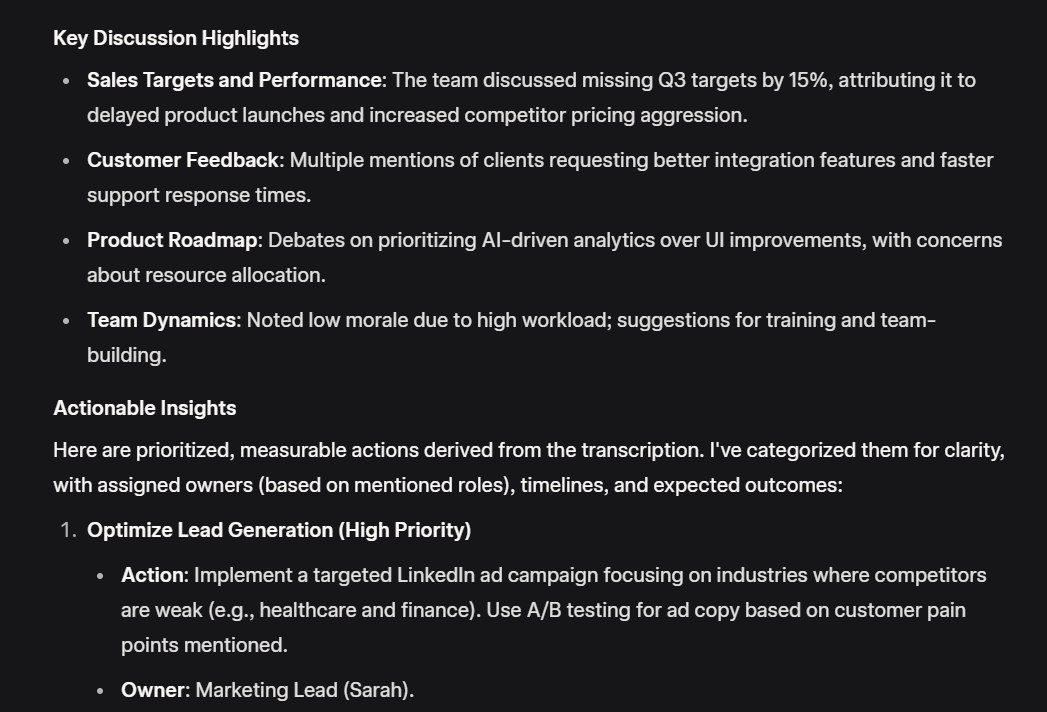 Это идеальный инструмент для руководителей, у которых нет времени на чтение десятков страниц транскриптов после каждого события. Он экономит сотни часов в год и помогает фокусироваться на важных вещах.